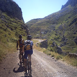 Gan ruta por la inmensidadad de los espacios pareciamos estar dentro del documental caminando entre dinosaurios , las vacas pastaban en rebaños y se moviancon una lentitud que las hacia irreales ,en la fotos no se aprecia pero te parabas un moneto para hacer una foto y alos dos minuos tus compañeros parecian un punto el lo lejos viendo asi la verdadera mannitud des las distancias . La promera subida la tomamos con calma pero sudabamos como condenados plato pequeño y ascender. En la parte intermedia cuando llegamos al valle entre las montañas etapa de navegacion , cada uno marchaba por donde mas le parecia ,intentando llegar al punto de destino de muchas maneras En el ultimo descenso pienso que de unos 12 km mas o menos rodabamos sobre pedrolos que ponian al limite la suspension ( aqui si que hay quye llevar una bici como la de Rider o mas )al llegar al coche me fijo que el disco delantero se habia puesto con un tono coñag por la temperatura , las pastillas recicladas perfectas si aguantaron esto aguantan cualquier cosa.
